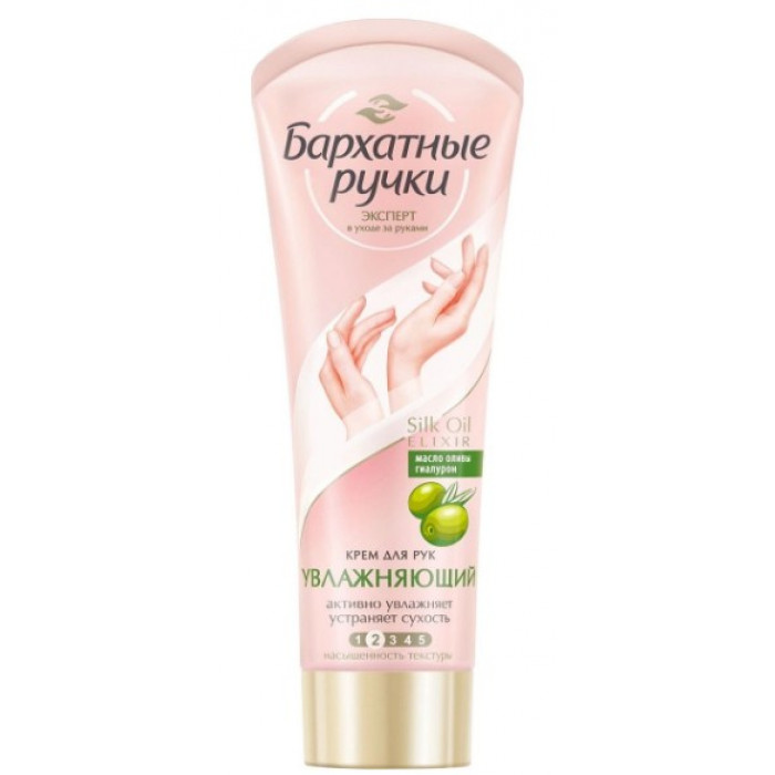 "Крем для рук Бархатные ручки ""Увлажняющий"" подарит Вам увлажнение и невероятную нежность! Благодаря легкой текстуре, крем активно увлажняет кожу рук и устраняет сухость. Специально разработанная формула крема активизирует способность кожи удерживать влагу. Формула Silk Oil Elixir усиливает действие крема. Микромасла восстанавливают клетки кожи и в комплексе с протеинами шелка делают ее мягкой и нежной.