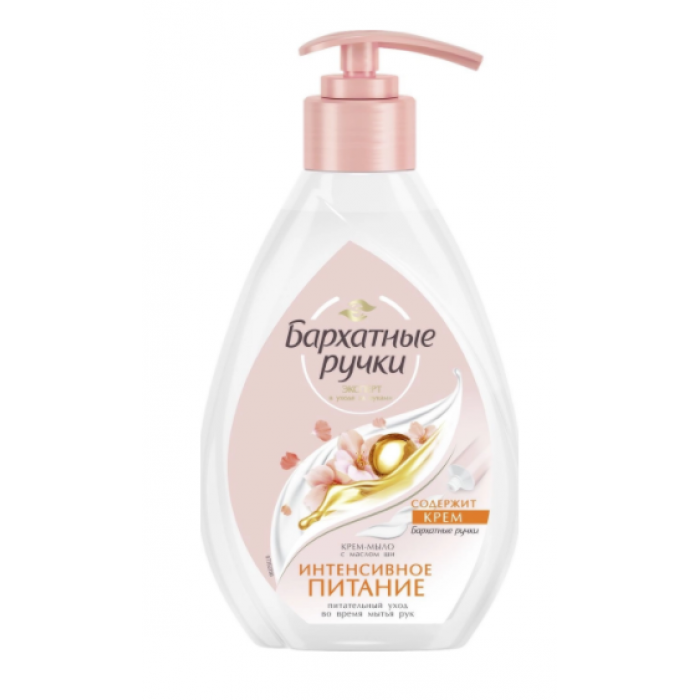 Чистые руки – твоя защита. Чаще мойте руки! Бренд Бархатные Ручки представляет крем-мыло для рук Интенсивное питание, с которым мытье рук превратится в косметическую процедуру по уходу. Крем-мыло содержит крем Бархатные Ручки, за счет чего обеспечивает нежное очищение и питание кожи во время мытья рук. Мыло удаляет бактерии, успешно смывая их с поверхности кожи вместе с другими ежедневными загрязнениями. Не содержит красителей[1]. Соответствует естественному уровню pH кожи. МАСЛО ШИ питает и восстанавливает клетки кожи. Масло ши оказывает смягчающее, увлажняющее и защитное действие. Подходит для ухода за кожей любого типа, особенно за сухой, раздраженной, поврежденной. Масло замедляет старение кожи. ПАНТЕНОЛ способствует восстановлению клеток, обладает увлажняющим и разглаживающим кожу действием. ВИТАМИН А ускоряет процесс обновления клеток кожи, участвует в образовании эпителия, в результате чего эпидермис производит больше белка, становясь толще. МАСЛО МИНДАЛЬНОЕ оказывает смягчающее, питательное и защитное действие на кожу, быстро впитывается. Ускоряет заживление при нарушениях целостности кожных покровов и нормализуют кислотно-щелочной баланс кожи. Подходит для любого типа кожи. ГЛИЦЕРИН оказывает смягчающее действие на кожу, увлажняет ее. Небольшие по размеру молекулы глицерина способны преодолевать липидный барьер кожи и проникать в глубокие слои эпидермиса. Исследования показали, что глицерин способствует нормальному процессу жизнедеятельности клеток эпидермиса. МАСЛО АВОКАДО замедляет старение кожи и предотвращает появление морщин. Питает кожу, способствует восстановлению ее защитного, иммунного барьера. Стимулирует выработку организмом коллагена и ускоряет процесс регенерации клеток кожи. МАСЛО КОСТОЧЕК ПЕРСИКА восстанавливает упругость, омолаживает, придает свежесть увядшей, морщинистой, утомленной и дряблой коже. РЕЗУЛЬТАТ: 100% нежная и мягкая кожа рук! [1]не содержит красителей, указанных в приложении 3 к ТР ТС 009/2011