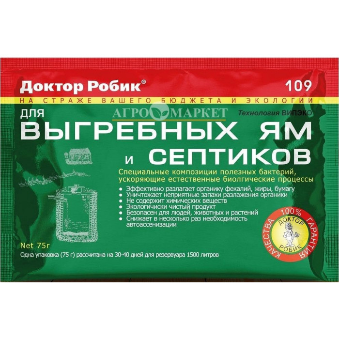 Культуры почвенные в спорах, входящие в состав средств Доктор Робик 109 (3 шт) способны в течение короткого времени утилизировать бумагу, фекалии, жиры, белки, целлюлозу, мочевину, крахмал. Ежемесячное применение позволит избежать заиливания пор в земле, образования окаменелостей и нерастворимых органических отложений в септиках и выгребных ямах. Благодаря своей формуле Доктор Робик 109 ускоряет естественные биологические процессы разложения. Один пакетик (75 г.) рассчитан на 30-40 дней для резервуара 1500 литров. Рекомендации по применению для септиков: содержимое пакетика высыпать в унитаз и дважды спустить воду или высыпать напрямую в септик. Для выгребных ям: содержимое пакетика развести в ведре воды и вылить в выгребную яму. Если яма обезвожена, добавить воды для активации действия бактерий. Безвредно для окружающей среды. Безопасно для людей, животных и растений.