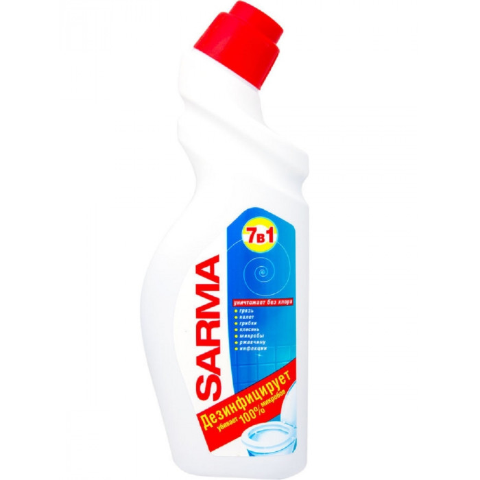 Чистящий гель для сантехники Сарма, 7в1 Дезинфицирующий, 750 мл, 1 шт (№7066) Удаляет грязь, налёт, грибок,микробы, бактерии, ржавчину и неприятные запахи, действует в течении 5 минут, легко наносится под ободок унитаза.