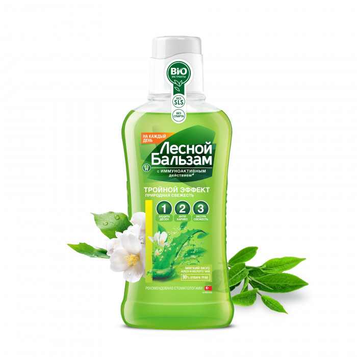Ополаскиватель Лесной бальзам с освежающим вкусом алоэ и белого чая позволяет достичь комплексного улучшения состояния зубов и десен¹: эффективно удаляет налет в недоступных для щетки местах, укрепляет эмаль и способствует заживлению десен.